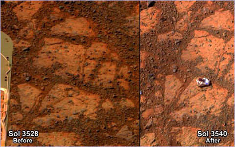 There Aliens? - Jan. 31, 2014 The Opportunity rover on Mars is in the news again because it took two pictures of the same spot on Mars a number of days apart, and in the second picture, a rock appeared that wasn't there before. Maybe a little green man threw it at the rover. Or maybe it is a colony of microbes. NASA says Opportunity was making a slow, pivot-like turn in which some of its wheels dragged the ground, and probably flicked up a rock. They're going to examine the rock because the side that is facing up has probably not been exposed for billions of years. |