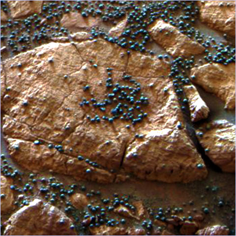 is a controversial photo taken by the Opportunity rover on Mars. The blue spherules are probably caused by erosion. |