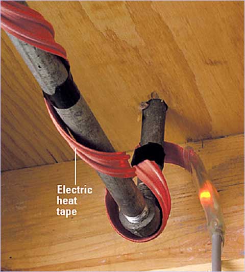 - Some people have "heat tape" on their pipes and don't know it. It's sort of like an electric blanket for your pipes. You'll see a plug somewhere and you just have to plug it in. If you have had problems with pipes freezing and bursting, and insulation hasn't solved it, consider heat tape. In the photo below, a galvanized steel pipe is wrapped in heat tape. An electrical plug, left dangling when not in use, extends down to the bottom right. This is how you "plug in" the heat tape. Often, there is a nearby electrical outlet, or outdoor extension cords are used. A switched outlet dedicated to the heat tape with an indoor switch would be ideal. Heat tape is not usually required on drain pipes, only incoming water pipes. If you're not sure which is which, consult a plumber... |